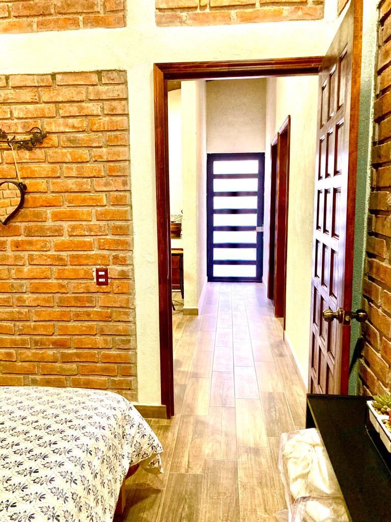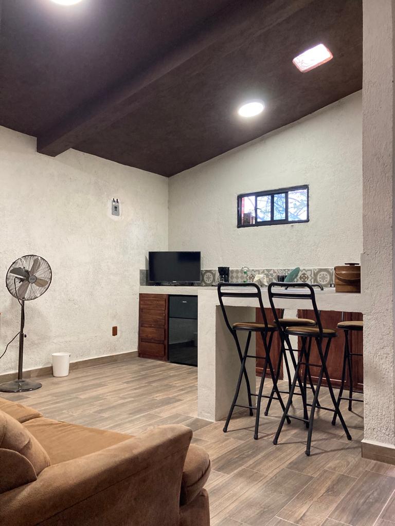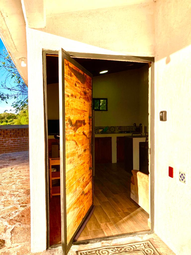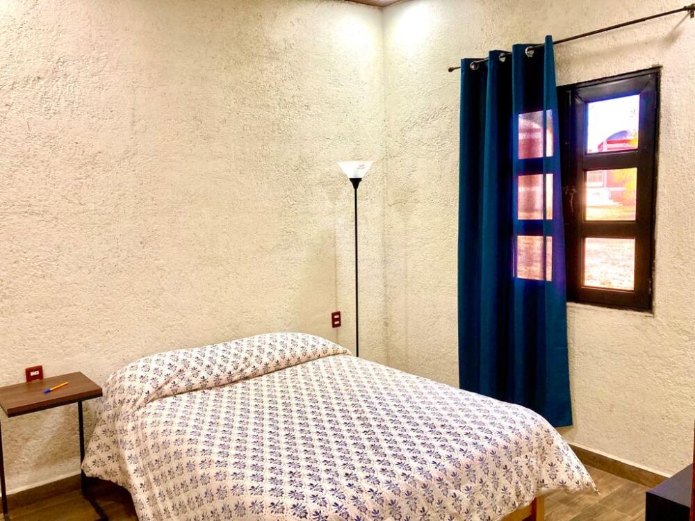 Casa campestre contemporánea con la comodidad de la ciudad en un Pueblo Mágico. Cuenta con dos habitaciones con una cama matrimonial cada una y un sofá cama matrimonial en la sala. Además de un área de cocina con estufa, frigobar, fregadero y utensilios básicos.