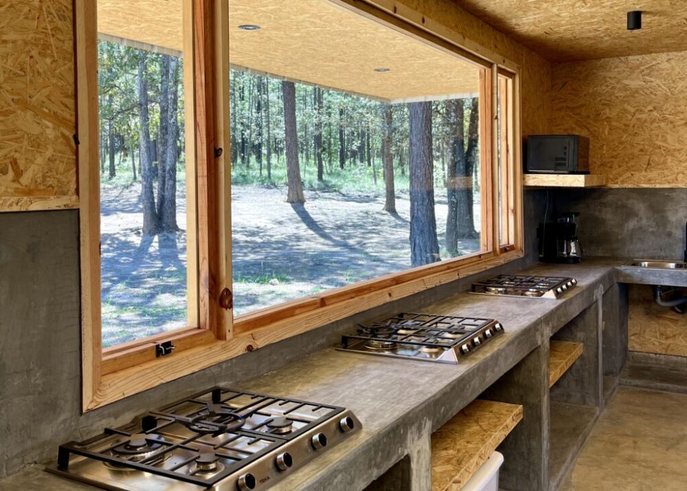 Al hospedarte con nosotros en habitación puedes hacer uso de la cocina común y de la palapa central para preparar cómodamente tus alimentos, al momento de tu registro se entrega un kit con loza y sartenes, también cuenta con refrigerador para almacenar tus perecederos. De hospedarte en dormitorio o acampando, su uso tiene un costo de 75 pesos por persona/noche., incluye el kit con loza y sartenes.
