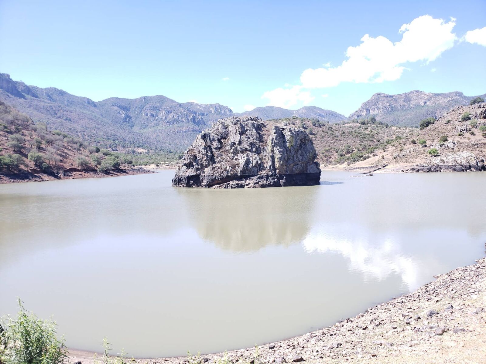 • Fotografía de Paisaje: No te pierdas la gran roca que sobresale en medio de la represa, un elemento visual único que cambia según el nivel del agua.